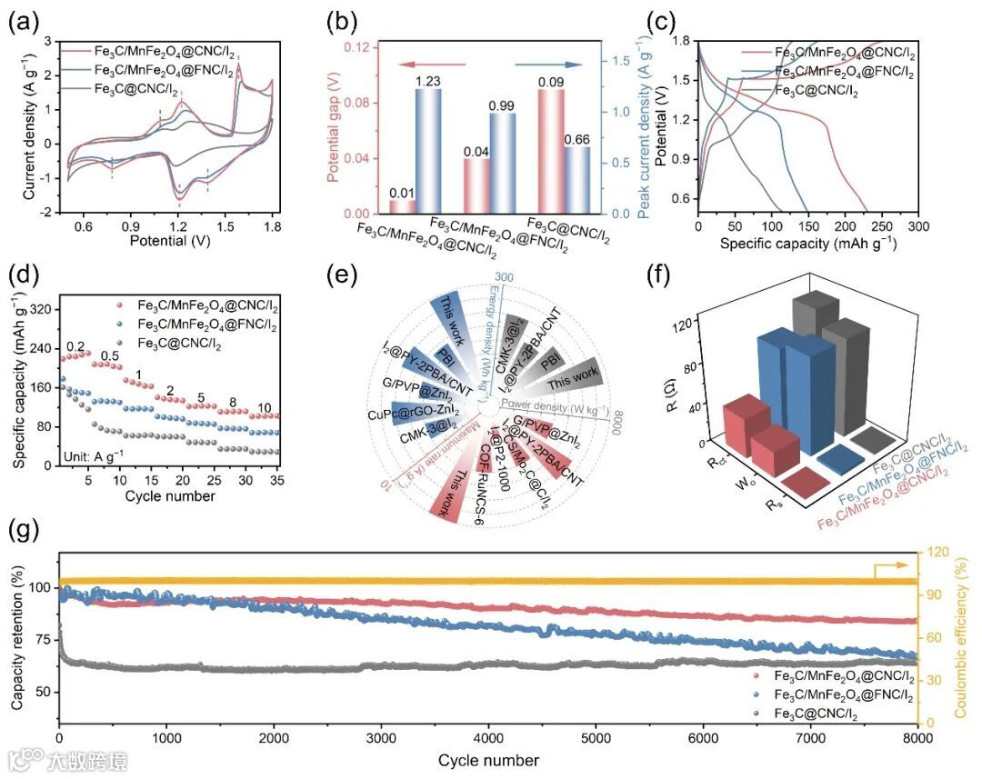 图 5. (a)扫描速率为1 mV s–1 时的循环伏安曲线。(b)从循环伏安曲线得出的相应峰值电流密度和电位差。(c)电流密度为0.2 A g–1时的恒电流充放电曲线。(d)不同电流密度下的比容量及相应的库仑效率。(e)Fe3C/MnFe2O4@CNC/I2与先前报道的Zn-I2电池的电化学性能雷达图。(f)电荷转移电阻(Rct)、电容(Wo)和欧姆电阻(Rs)。(g)2 A g–1下的循环性能。