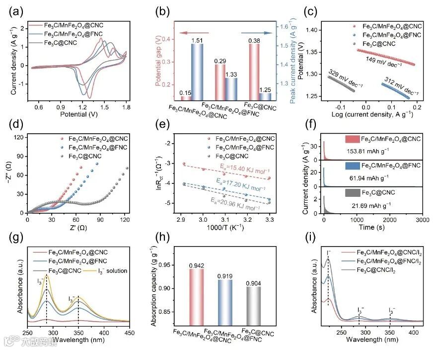图 3. (a)电催化剂在 2 M ZnSO4 + 0.1 M ZnI2 溶液中的循环伏安曲线。(b)基于循环伏安曲线的碘氧化还原反应的相应氧化峰电流密度和电位差。(c)基于循环伏安曲线的相应塔菲尔曲线。(d)电催化剂在 2 M ZnSO4+ 0.1 M ZnI2 溶液中于最佳还原电位下的电化学阻抗谱。(e)相应于 Rct 的倒数与绝对温度的倒数的阿伦尼乌斯图。(f)在 0.1 M ZnI2 + 2 M ZnSO4溶液中的碘成核测试。(g)原始I3–离子和吸附不同电催化剂 24h后的溶液的紫外-可见光谱。(h)不同电催化剂对I3–的相应吸附容量。(i)Fe3C/MnFe2O4@CNC/I2、Fe3C@CNC/I2和Fe3C/MnFe2O4@FNC/I2浸泡72h后的ZnSO4溶液的紫外-可见光谱。