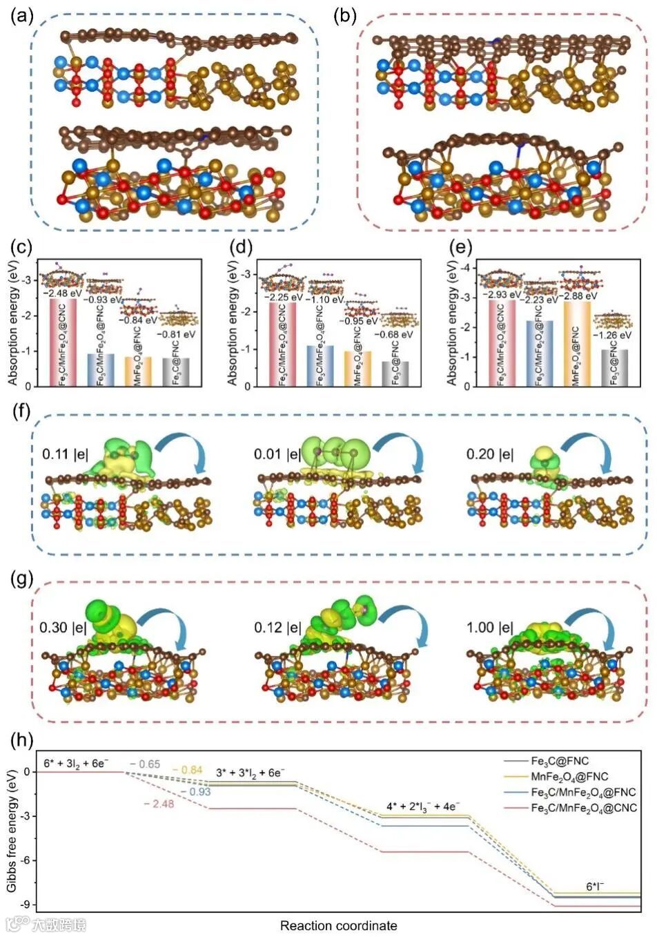 图 4. (a)Fe3C/MnFe2O4@FNC(顶视图和侧视图)和(b)Fe3C/MnFe2O4@CNC(顶视图和侧视图)的计算模型。在 Fe3C/MnFe2O4@CNC、Fe3C/MnFe2O4@FNC、MnFe2O4@FNC 和Fe3C/@FNC 上(c)I2、(d)I3–和(e)I–的吸附能及相应的吸附模型。与I2、I3–和I–物种相互作用后优化的(f)Fe3C/MnFe2O4@FNC 和(g)Fe3C/MnFe2O4@CNC 结构的差分电荷密度图。绿色和黄色分别代表电荷耗尽和电荷积累。(h)不同晶面上I2还原的能量曲线。