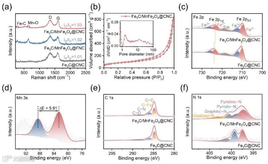 图2. (a)拉曼光谱。(b)N2 吸附-脱附等温线和孔径分布曲线(插图)。(c)的高分辨率 Fe 2p XPS 光谱。(d)Fe3C/MnFe2O4@CNC的高分辨率 Mn 3s XPS 光谱。 高分辨率(e)C 1s 和(f)N 1s XPS光谱。