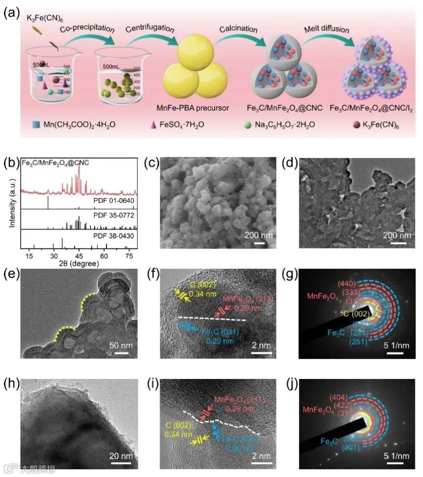 图1 (a)Fe3C/MnFe2O4@CNC/I2合成过程的示意图。Fe3C/MnFe2O4@CNC的(b)XRD 图谱,(c)SEM 图像,(d、e)TEM 图像,(f)HRTEM 图像以及(g)SAED 图像。Fe3C/MnFe2O4@CNC的(h)TEM 图像,(i)HRTEM 图像以及(j)SAED 图像。