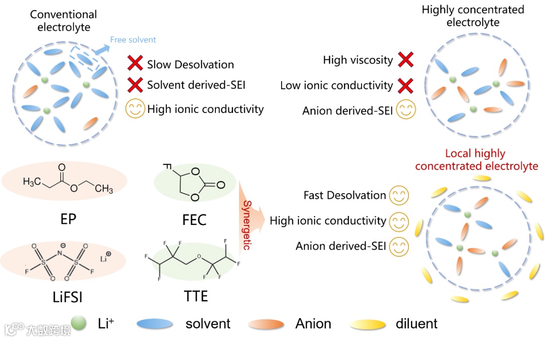 图1. 不同电解质的优势与不足、该工作中局部高浓度电解液的溶剂组成及其优势