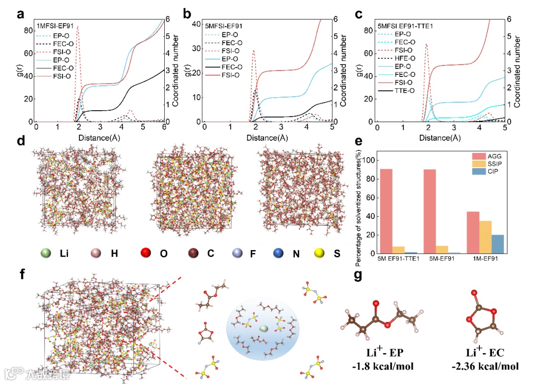图3. 分子动力学模拟研究电解液的溶剂化构型