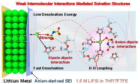 本文的核心要点在于揭示了弱相互作用在电解液溶剂化结构调节中的关键作用。通过深入的机理研究,团队发现电解液中存在的弱相互作用(如偶极-偶极相互作用、阴离子-偶极相互作用)能够有效地削弱溶剂化结构中锂离子(Li+)与THF分子之间的结合力。这种对溶剂化壳层的微调极大地促进了锂离子的脱溶剂动力学过程,从而在界面处实现了均匀的锂沉积。实验结果显示,该电解液能够实现高达99.3%的锂沉积/剥离库仑效率,显著抑制了枝晶的产生。