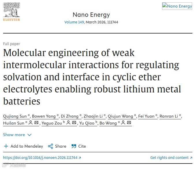 近日,河北科技大学王波教授团队联合厦门大学乔羽教授、邹业国副教授等,在顶级能源期刊《Nano Energy》上发表了题为“Molecular Engineering of Weak Intermolecular Interactions for Regulating Solvation and Interface in Cyclic Ether Electrolytes Enabling Robust Lithium Metal Batteries”的研究工作,提出了一种基于弱相互作用的溶剂化化学调节策略。该研究以四氢呋喃(THF)为基础溶剂体系,并引入低熔点稀释剂1,1,2,2-四氟乙基-2,2,2-三氟乙基醚(TFTFE),通过分子工程方式对溶剂化结构与界面反应路径进行协同调节,从而实现对锂沉积行为与低温性能的同步优化。