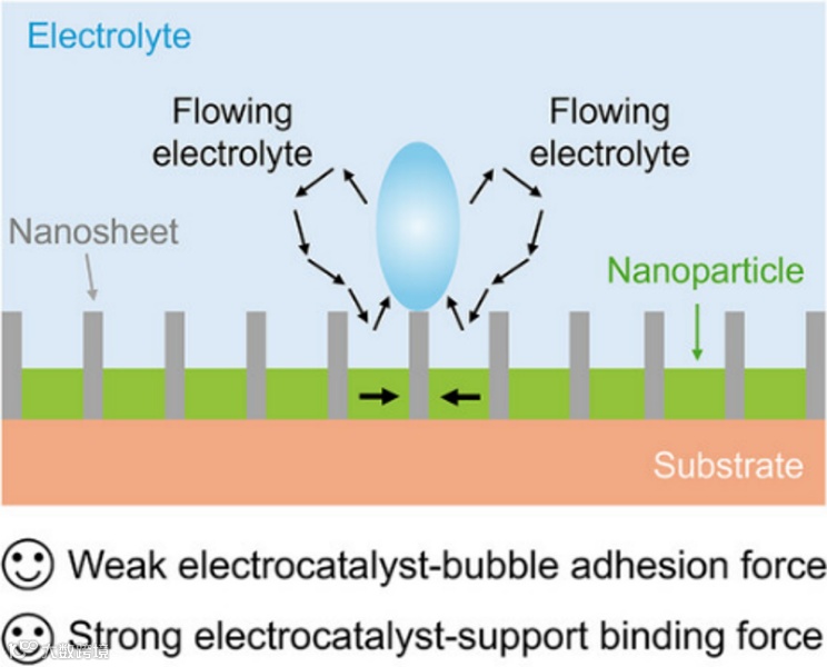 电化学析气反应(GERs)是能源转化与存储技术(如电解水、燃料电池、二氧化碳电还原)的核心过程,在工业规模化应用中占据关键地位。然而,高电流密度下,快速连续的气泡脱附会产生剧烈的机械冲击,导致催化剂层剥离、性能衰减,这一问题已成为制约GERs技术工业化的核心瓶颈。催化剂的稳定性主要由两个关键界面决定:一是催化剂-气泡界面,其主导气泡的吸附与脱附动力学;二是催化剂-基底界面,其控制催化剂层与基底的结合强度。高电流密度下,快速生成的气泡脱附时产生的粘附力若超过催化剂与基底的界面结合强度,会引发催化剂脱落或结构失效。传统解决方案中,聚合物粘结剂机械强度不足且易堵塞活性位点,无粘结剂的一维/二维纳米阵列虽能削弱气泡粘附,但降低了催化剂与基底的接触面积,导致界面结合力减弱、机械耐受性不足,形成“气泡粘附弱化”与“基底结合强化”的固有矛盾。如何同时优化这两个界面,是构建高稳定性、高性能工业级GERs催化剂的关键挑战。