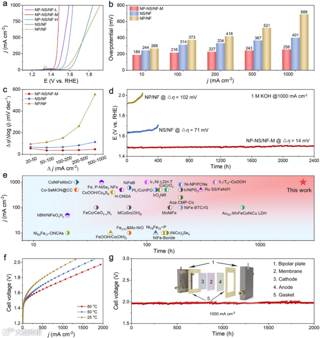 如图2所示,在1 mol/L KOH电解液中,NP-NS/NF-M表现出最优的OER活性:电流密度500 mA/cm2时过电位仅243 mV,1000 mA/cm2时过电位256 mV,远低于纯纳米片阵列(NS/NF:500 mA/cm2时367 mV,1000 mA/cm2时401 mV)和纯纳米颗粒(NP/NF:500 mA/cm2时521 mV,1000 mA/cm2时688 mV)。高电流区间的Δη/Δlog(j)斜率稳定在43 mV/dec,表明气泡脱附高效、传质迅速,无明显浓差极化。在1000 mA/cm2下连续运行2400小时,过电位仅增加14 mV,远超大多数同类型催化剂;经过10000次循环伏安(CV)扫描后,性能无显著衰减,远优于NS/NF(71 mV增幅)和NP/NF(102 mV增幅)。以NP-NS/NF-M为双功能电极组装AEMWE,在1 mol/L KOH中测试时,25 ℃、50 ℃、80 ℃下,1000 mA/cm2对应的槽电压分别为1.95 V、1.85 V、1.76 V;25 ℃、1000 mA/cm2下连续运行2000小时,槽电压几乎无波动,证实其工业应用潜力。
