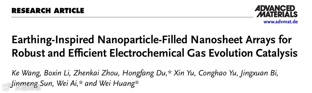 近日,来自下西北工业大学的黄维院士团队艾伟教授与福建师范大学杜洪方副教授合作,在国际知名期刊Advanced Materials上发表题为“Earthing-Inspired Nanoparticle-Filled Nanosheet Arrays for Robust and Efficient Electrochemical Gas Evolution Catalysis”的观点文章。本论文受农业培土技术启发,报道了一种纳米颗粒适量填充的纳米片阵列结构,通过磷化控制的受限生长策略制备,借助纳米颗粒与纳米片的协同作用实现双界面优化。实验与有限元模拟结果表明,纳米片空隙内气泡失稳引发的电解液流动可促进气体高效释放,从而降低催化剂-气泡界面粘附力;同时,嵌入的纳米颗粒具有更高的临界屈曲力,可增强纳米片阵列的结构刚性,显著提升催化剂-基底界面结合力。将该结构用作析氧反应(OER)催化剂时,电极在1000 mA/cm2电流密度下仅需256 mV过电位,且能稳定运行2400小时,性能跻身高电流密度下OER催化剂前列。此外,该设计策略具有普适性,可拓展至析氢反应(HER)、尿素氧化反应(UOR)和肼氧化反应(HzOR)等其他析气反应。本研究凸显了纳米颗粒填充纳米结构在优化界面力学性能、开发耐用高性能GERs催化剂方面的巨大潜力。