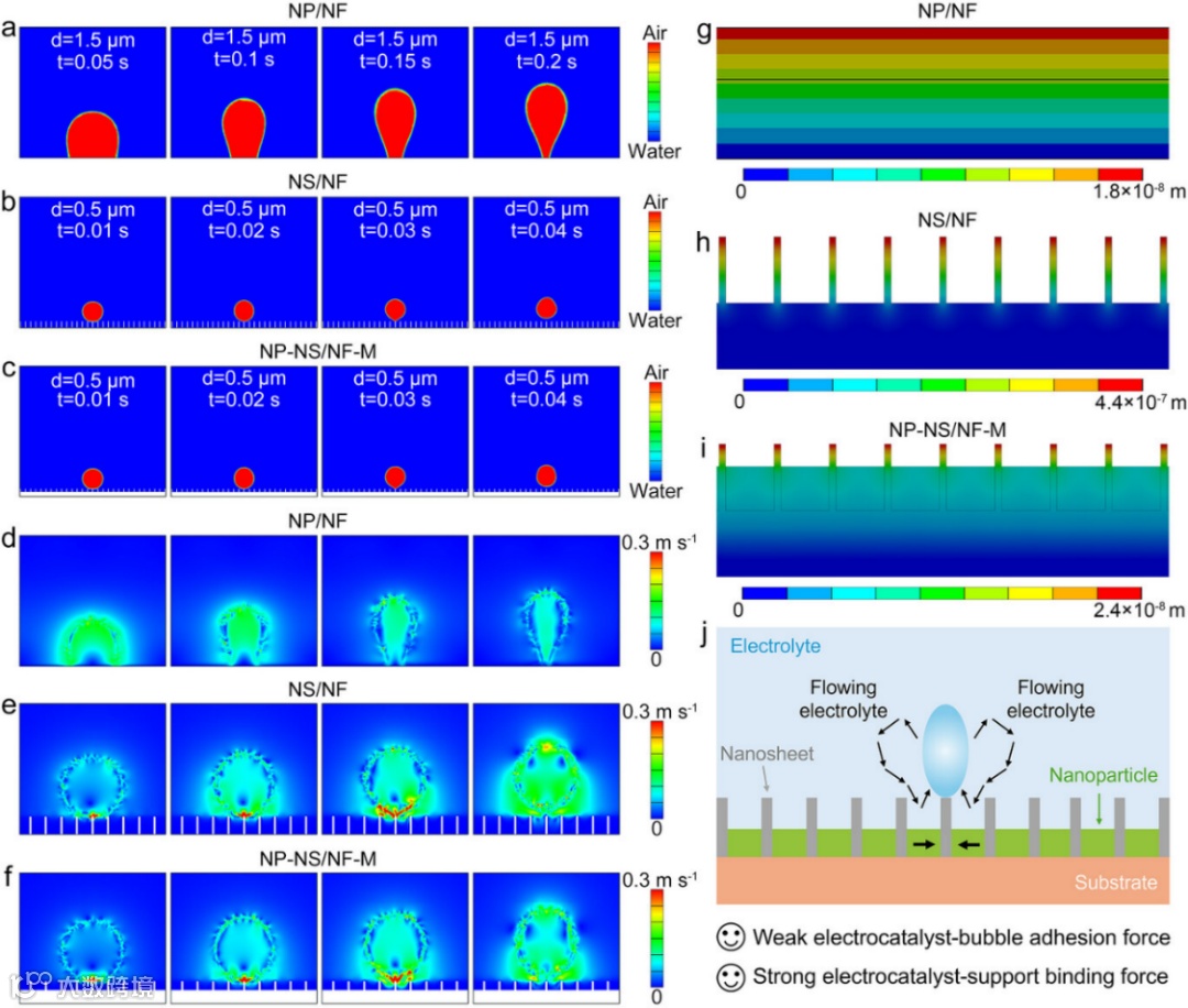 为了进一步揭示双界面优化的内在机理,我们进行了有限元模拟,如图4所示。结果表明:纳米片阵列形成的层级空隙和开放通道,使气泡脱附的临界尺寸从NP/NF的1.5 μm降至0.5 μm,脱附时间从0.2 s缩短至0.04 s;气泡失稳诱导局部电解液流动(流速0.3 m/s),进一步促进气泡释放。此外,我们以施加10 μN向上的力模拟气泡粘附力,NS/NF的变形量达4.4×10-7 m,而NP-NS/NF-M的变形量仅2.4×10-8 m,机械韧性提升约18倍,有效抵抗气泡冲击导致的剥离。
