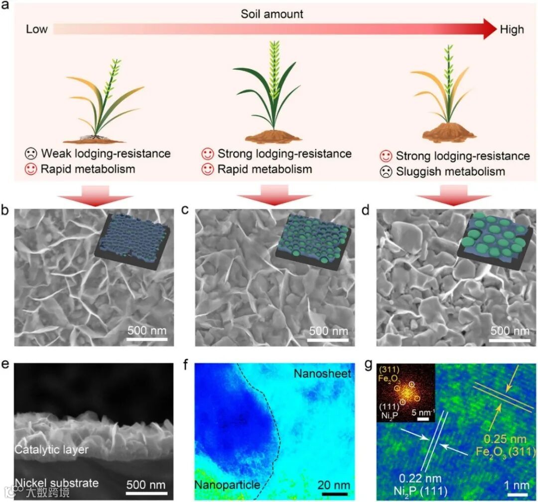 如图1所示,以镍泡沫为基底,采用两步法制备目标催化剂:前驱体制备:将镍泡沫浸入K2FeO4与NaOH混合溶液,通过K2FeO4水解在基底上生长FeOOH纳米片阵列(FeOOH/NF),其片间平均孔径约249nm。磷化受限生长:将FeOOH/NF与次磷酸钠分别置于管式炉下游和上游,在250℃、Ar气氛下退火2小时。次磷酸钠缓慢分解产生PH3气体,与镍泡沫反应生成Ni2P纳米颗粒,在FeOOH纳米片间隙中受限生长,形成纳米颗粒填充结构。通过调控磷化时间(1小时、2小时、3小时),可精准控制纳米颗粒填充量,得到低填充(NP-NS/NF-L)、中填充(NP-NS/NF-M)、高填充(NP-NS/NF-H)三种样品。扫描电子显微镜(SEM)显示:NP-NS/NF-M呈现均匀的纳米颗粒填充纳米片阵列结构,纳米片垂直排列,纳米颗粒嵌入片间空隙,催化层与镍基底紧密接触;横截面SEM表明,纳米颗粒尺寸约326nm,纳米片高度约518nm。透射电子显微镜(TEM)证实:纳米颗粒与纳米片形成一体化结构;高分辨TEM(HRTEM)观察到两组晶格条纹——0.22nm对应Ni2P的(111)晶面,0.25nm对应Fe2O3的(311)晶面(Fe2O3由FeOOH热脱水生成),傅里叶变换(FFT)图谱进一步验证了两相共存。