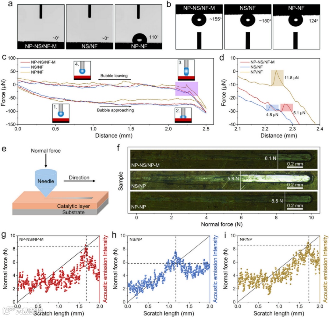 进一步评估了催化剂的双界面力学特性,如图3所示。催化剂-气泡界面优化:接触角测试表明NP-NS/NF-M表现出超亲水性(电解液接触角≈0°)和超疏气性(气泡接触角≈155°),利于电解液浸润和气泡脱附,类似于NS/NF样品。与之相反,NP/NF为疏水性(接触角≈110°),气泡接触角仅124°,气泡粘附严重。采用高灵敏度微机电天平进行了粘附力测试,测得NP-NS/NF-M的催化剂-气泡界面粘附力仅4.8 μN,类似于NS/NF样品,是NP/NF(11.8 μN)的1/2.5,显著降低了气泡脱附时的机械冲击。通过微划痕测试对在镍片基底上制备的NP-NS/NP-M(平面样品)进行测试来评估催化剂-基底界面结合力,催化剂层剥离的临界载荷达8.1 N,显著高于纯纳米片阵列(NS/NP:5.8 N),与纯纳米颗粒(NP/NP:8.5 N)相当,证实纳米颗粒起到“机械锚定”作用,增强了催化剂与基底的结合强度。