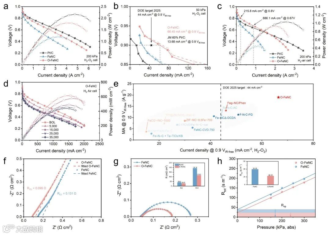 图4. 非贵阴极催化剂组装的PEMFC性能分析。