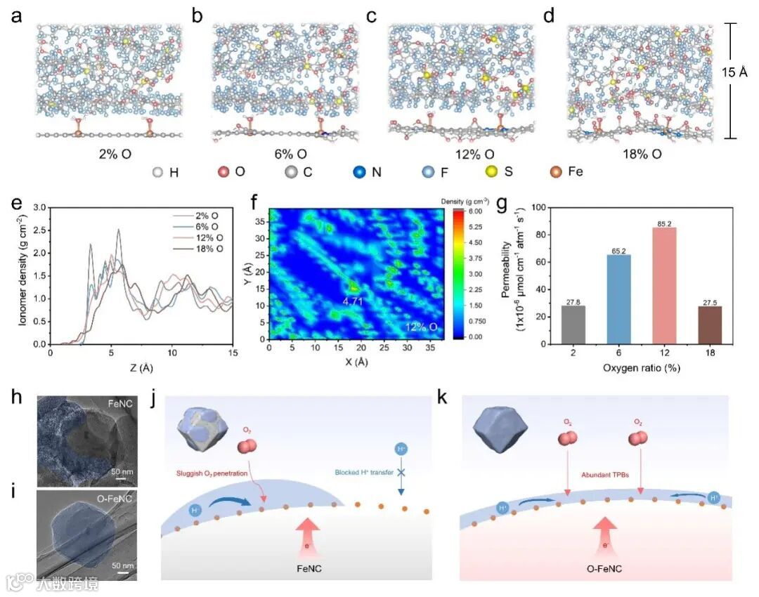 引入的C=O基团可与PFSA离聚物侧链中的磺酸基团通过氢键产生相互作用,调控离聚物的相分离结构,形成了更高的界面质子浓度和氧气渗透效率。通过改善催化剂表面与离聚物之间的界面相容性,C=O基团诱导形成了更加均匀、薄层化的离聚物覆盖结构。该界面调控显著优化了水合质子与氧气向Fe活性位点的协同输运,扩大了有效的催化剂–H3O+–O2三相反应界面,从而促进了活性位点在实际PEMFC工况下的高效利用。