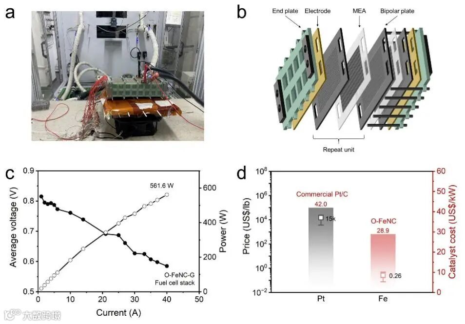 通过简化的球磨结合二次热解工艺,成功实现了高负载Fe–N–C催化剂的克级规模制备(O-FeNC-G),其三电极及膜电极性能与O-FeNC基本一致,验证了该策略在放大过程中的可靠性。在此基础上,研究团队进一步组装了基于O-FeNC-G阴极的燃料电池电堆,实现了561.6 W的输出功率。成本分析表明,O-FeNC-G 阴极对应的催化剂成本仅为US$28.9 kW−1,显著低于商用 Pt 基阴极(US$42.0 kW−1)。以上结果表明了该 Fe–N–C 催化剂体系具备良好的应用前景,强调了非贵金属催化剂的商业化仍需在催化剂活性、MEA设计与电堆架构层面开展更深度的协同优化。
