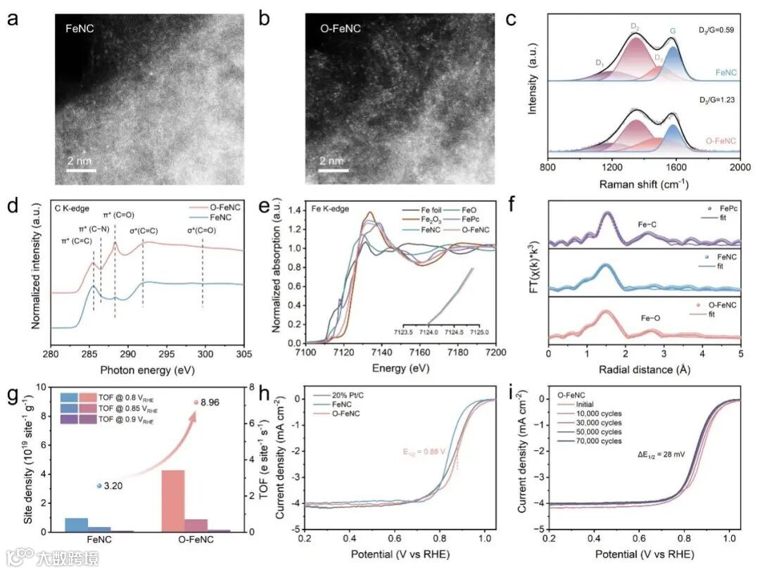 通过温和的超氧自由基(O2−)刻蚀策略在碳载体中引入丰富的C=O连接基团,其兼具对Fe物种的吸附能力和高温热解下的稳定性。理论计算表明,C=O在热解过程中作为硬碱型锚定位点,可以捕获和稳定气相中的酸性Fe物种,并促使其向单分散位点转变。这一策略可以有效地促进FeN4单原子位点的高密度构筑。得益于该亲铁载体效应,O-FeNC 催化剂实现了高达 8.96 × 1019 sites g−1的可及活性位点密度,处于当前 Fe–N–C 催化剂体系的领先水平。