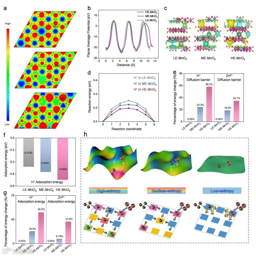 Figure 4 Theoretical analysis of selective proton acceleration channel in boosting H+ storage. (a) ELF (Electron localization function) results, (b) Electrostatic potentials, and (c) 2D electron density difference of LE-MnO2, ME-MnO2, and HE-MnO2. Diffusion barriers of (d) H+ on LE-MnO2, ME-MnO2, and HE-MnO2. (e) Percentage reduction in diffusion barriers of H+ and Zn2+ for ME-MnO2 and HE-MnO2 compared with LE-MnO2. Adsorption energies of (f) H+ in LE-MnO2, ME-MnO2, and HE-MnO2. (g) Percentage reduction in adsorption energies of H+ and Zn2+ for ME-MnO2and HE-MnO2compared with LE-MnO2. (h) Schematic diagram of selective proton transport accelerated by selective acceleration paths of gradient built-in electric field.
