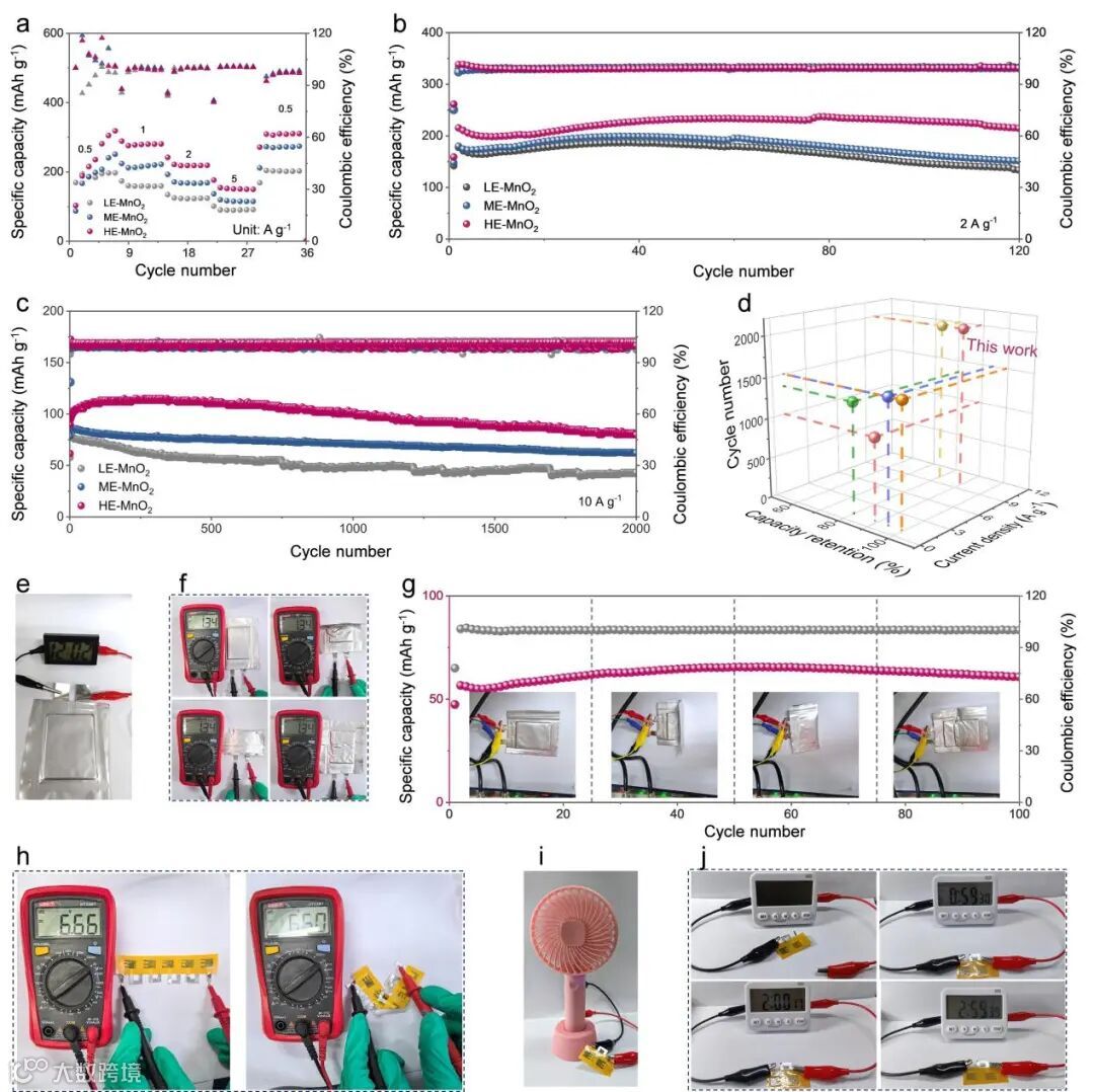 Figure 5 High-performance zinc ion battery with HE-MnO2. (a) Rate performance of LE-MnO2, ME-MnO2, and HE-MnO2batteries. Cycling performance at (b) 2 A g-1 and (c) 10 A g-1. (d) Comparison of long-term cycling performance of this work with other previous work. (e) An optical photo showing a flexible pouch cell successfully powering the electronic clock. (f) Open-circuit voltages and (g) Cycling performance of the flexible pouch cell at different bending states. (h) Open-circuit voltages of the flexible integrated microcell at different bending states. (i) The integrated microcell powers small fan. (j) The integrated microcell powers a timer for long periods.