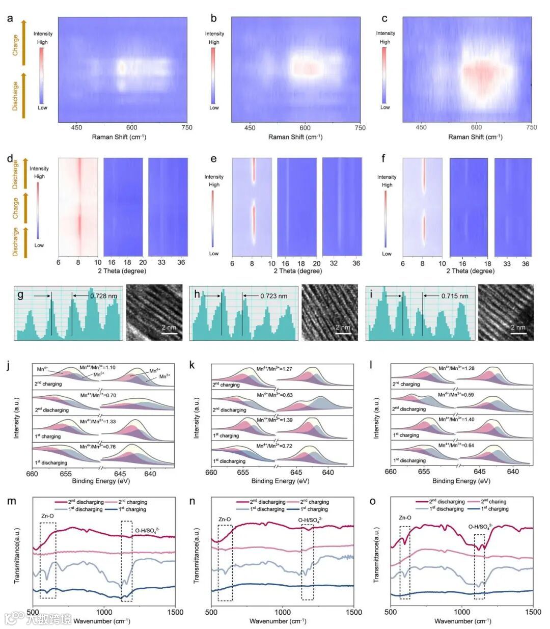 Figure 3 Reaction mechanism of LE-MnO2, ME-MnO2, and HE-MnO2. In-situ Raman spectra of (a) LE-MnO2, (b) ME-MnO2, and (c) HE-MnO2. In-situ XRD patterns of (d) LE-MnO2, (e) ME-MnO2, and (f) HE-MnO2. Fast Fourier transformation (FFT) patterns and magnified HR-TEM images of (g) LE-MnO2, (h) ME-MnO2, and (i) HE-MnO2. XPS spectra of Mn in (j) LE-MnO2, (k) ME-MnO2, and (l) HE-MnO2. FTIR spectra of (m) LE-MnO2, (n) ME-MnO2, and (o) HE-MnO2.