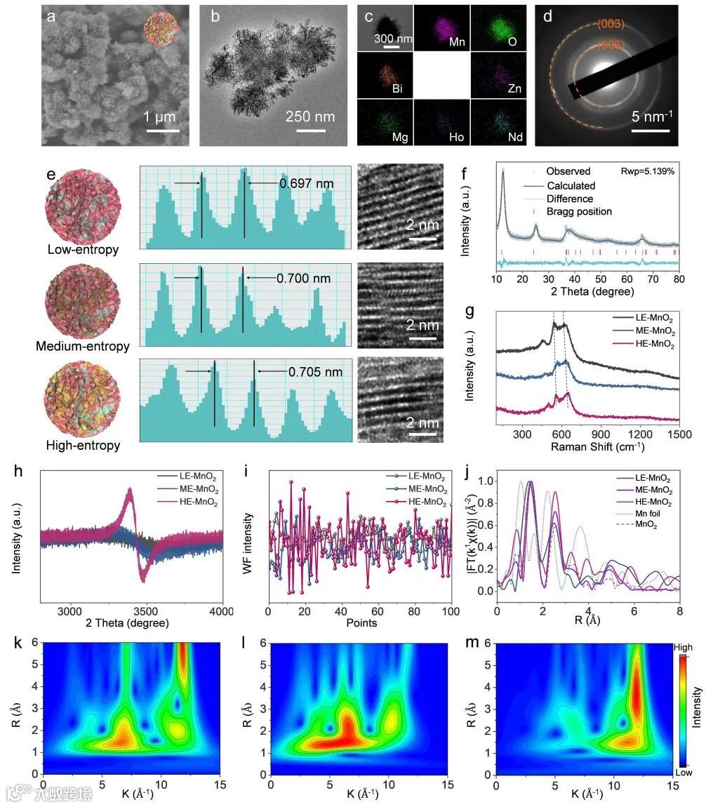 Figure 1 Structural and compositional analysis of LE-MnO2, ME-MnO2, and HE-MnO2. (a) SEM and (b) TEM of HE-MnO2. (c) Elemental mapping images of HE-MnO2. (d) Selected area electron diffraction (SAED) of HE-MnO2. (e) Structure and composition schematic images, Fast Fourier transformation (FFT) patterns, and magnified HR-TEM images of LE-MnO2, ME-MnO2, and HE-MnO2. (f) Rietveld XRD patterns, (g) Raman spectra, (h) EPR spectra, and (i) Work function obtained from the Kelvin Probe Force Microscopy of LE-MnO2, ME-MnO2, and HE-MnO2. (j) FT-EXAFS spectra of LE-MnO2, ME-MnO2, and HE-MnO2. Wavelet-transformed k3-weighted EXAFS spectra of (k) LE-MnO2, (l) ME-MnO2, and (m) HE-MnO2.