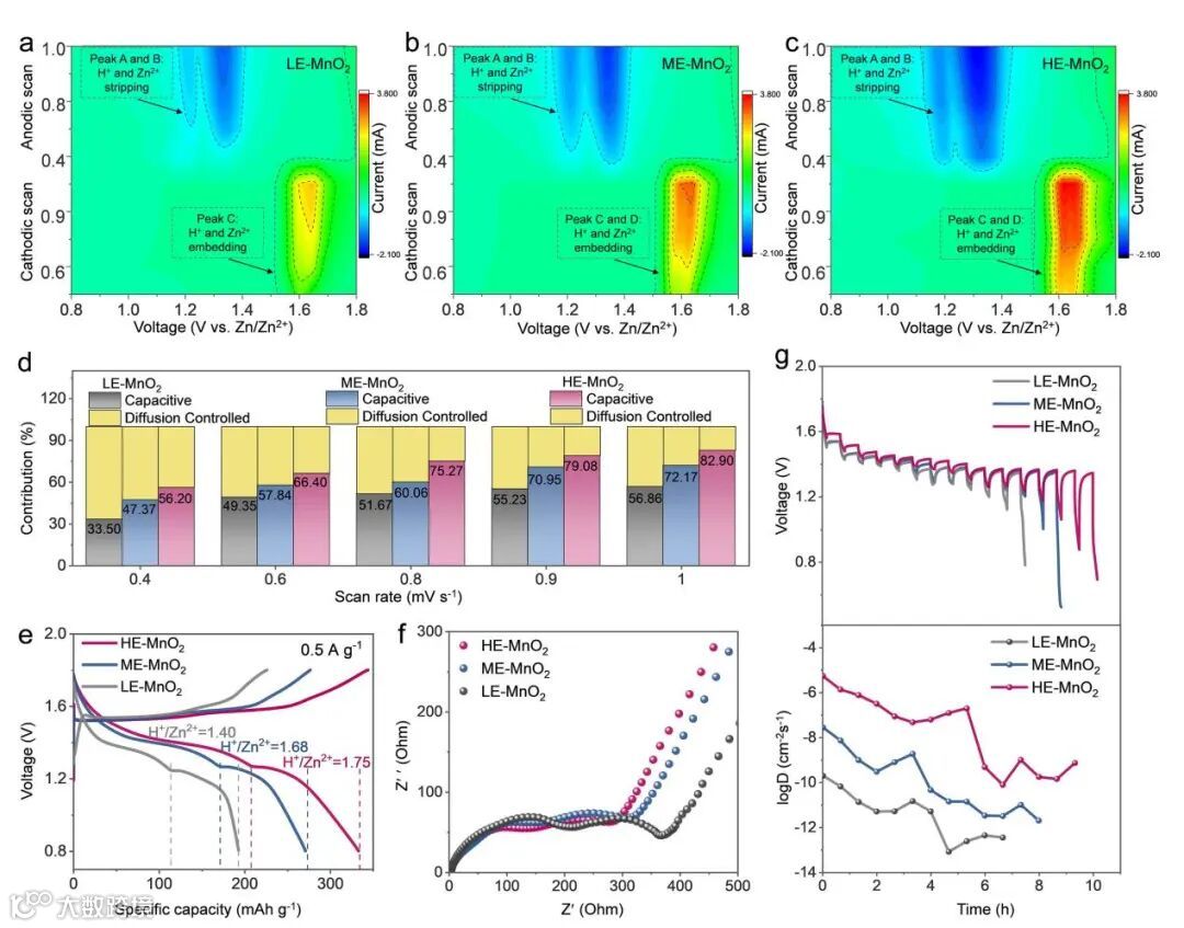 Figure 2 Kinetic analysis and comparison of LE-MnO2, ME-MnO2, and HE-MnO2. CV curves of (a) LE-MnO2, (b) ME-MnO2, and (c) HE-MnO2. (d) Capacitive and diffusion contributions, (e) H+ and Zn2+ ratio calculated from the GCD curves, (f) EIS plots, and (g) Gitt plots of LE-MnO2, ME-MnO2, and HE-MnO2.