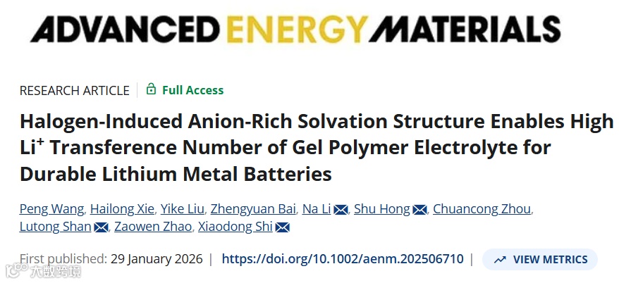 P. Wang, H. Xie, Y. Liu, et al. “Halogen-Induced Anion-Rich Solvation Structure Enables High Li+ Transference Number of Gel Polymer Electrolyte for Durable Lithium Metal Batteries.” Advanced Energy Materials (2026): e06710.