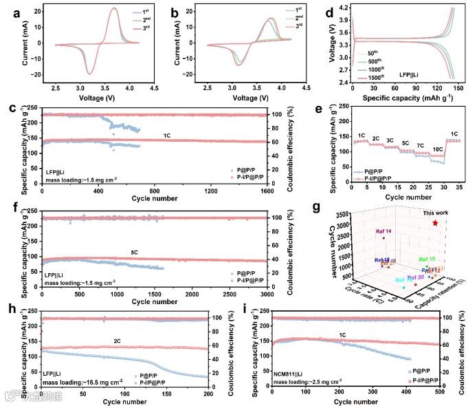 图5 (a) P-I/P@P/P和(b) P@P/P凝胶聚合物电解质中Li||LiFePO4电池的循环伏安曲线;(c) 1C倍率下不同凝胶聚合物电解质中Li||LiFePO4电池的循环性能及(d) 恒电流充放电曲线;(e) 不同凝胶聚合物电解质中Li||LiFePO4电池的倍率性能;(f) 5C倍率下不同凝胶聚合物电解质中Li||LiFePO4电池的循环性能;(g) Li||LiFePO4电池采用先进凝胶聚合物电解质在高倍率(≥3C)下的循环性能对比;(h) 高正极负载量(16.5 mg cm-2)条件下,2C倍率时不同凝胶聚合物电解质中Li||LiFePO4电池的循环性能;(i) 1C倍率下不同凝胶聚合物电解质中Li||LiNi0.8Co0.1Mn0.1O2电池的循环性能。