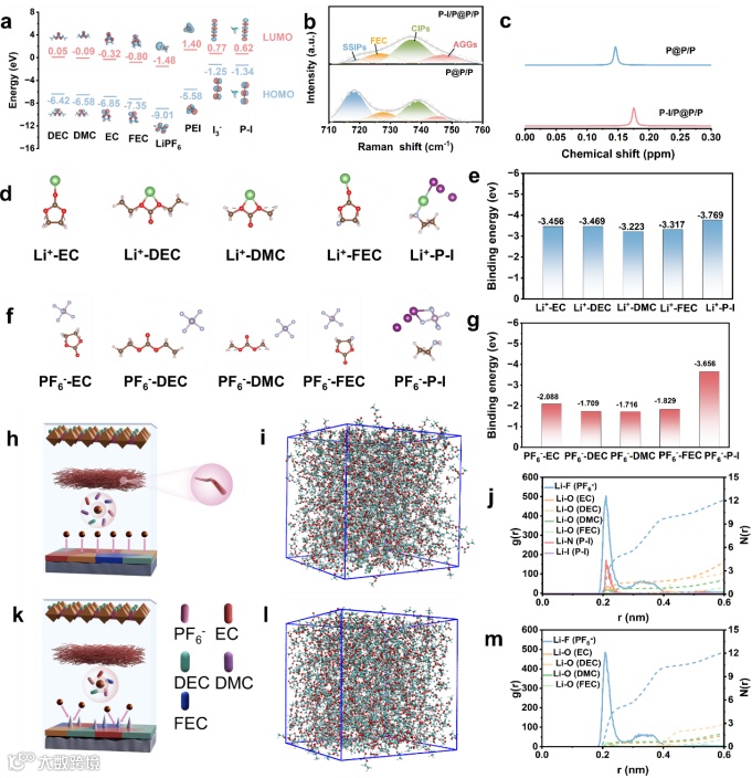 图2 a) DEC、DMC、EC、FEC、LiPF6、PEI、I3-及PEI-I复合物的计算HOMO-LUMO能级;(b) P-I/P@P/P和P@P/P GPE的拉曼光谱及(c) 7Li NMR谱;(d) Li+与EC、DEC、DMC、FEC及PEI-I的优化结合构型及(e) 计算结合能;(f) PF6-与EC、DEC、DMC、FEC及PEI-I的优化结合构型及(g) 计算结合能;(h) P-I/P@P/P和(k) P@P/P GPE在LMB中的作用机理示意图;(i) P-I/P@P/P和(l) P@P/P GPE的分子动力学模拟快照;(j) P-I/P@P/P和(m) P@P/P GPE的径向分布函数与配位数