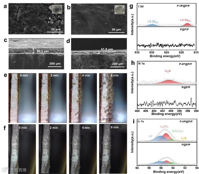 图3 (a, c) P@P/P及(b, d) P-I/P@P/P凝胶聚合物电解质循环50次后锂沉积形貌的表面及截面扫描电子显微镜图像;采用(e) P@P/P和(f) P-I/P@P/P凝胶聚合物电解质的锂对称电池中锂金属沉积的原位光学图像;采用P@P/P及P-I/P@P/P凝胶聚合物电解质的锂对称电池循环10次后,用于锂金属固体电解质界面组分分析的高分辨(g) I 3d谱、(h) N 1s谱及(i) Li 1s谱。
