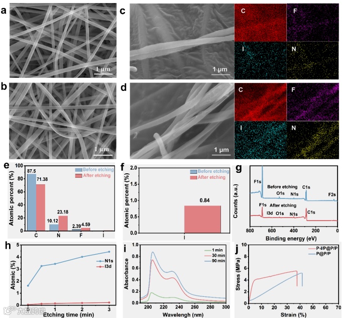 图1 (a) P@P/P 和 (b) P-I/P@P/P 纤维膜的SEM图像;(c) 蚀刻处理和 (d) 蚀刻处理后 P-I/P@P/P 纤维膜的元素分布图谱;(e) 蚀刻前后 P-I/P@P/P 纤维膜中 C/N/F 及 (f) I 元素含量分析;(g) 蚀刻前后 P-I/P@P/P 纤维膜的XPS全谱;(h) P-I/P@P/P 纤维膜在不同蚀刻时间后 N 与 I 元素的原子比;(i) P-I/P@P/P 纤维膜经电解液浸泡不同时间后的紫外-可见吸收光谱;(j) P-I/P@P/P 与 P@P/P 纤维膜的应力-应变曲线。