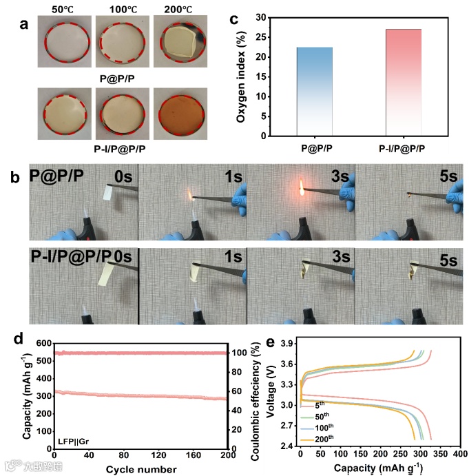 图6 (a) P-I/P@P/P与P@P/P纤维膜的热耐受性测试、(b) 阻燃性测试及(c) 极限氧指数测试;(d) LiFePO4||石墨(LFP||Gr)软包电池在P-I/P@P/P凝胶聚合物电解质中于1C倍率下的循环性能及(e) 相应的恒电流充放电曲线。