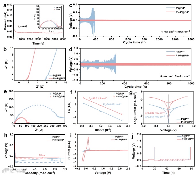 图4 (a) P-I/P@P/P凝胶聚合物电解质中锂对称电池的计时电流曲线(插图:计时电流测试前后的电化学阻抗谱变化);(b) P@P/P和P-I/P@P/P凝胶聚合物电解质的离子电导率;不同凝胶聚合物电解质中锂对称电池在(c) 1 mA cm-2和(d) 5 mA cm-2电流密度下的循环性能;(e) 不同凝胶聚合物电解质中锂对称电池首次循环后的电化学阻抗谱对比;(f) 不同凝胶聚合物电解质中锂对称电池的界面活化能垒;(g) 不同凝胶聚合物电解质中锂对称电池的塔菲尔曲线;(h) 通过组装锂铜电池测试的不同凝胶聚合物电解质中铜箔表面的锂成核过电位;(i) 不同凝胶聚合物电解质中锂铜电池的循环伏安曲线及(j) 库伦效率计算结果。