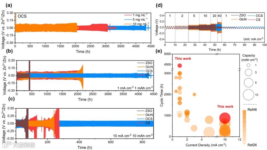 经多组浓度梯度实验系统筛选,5 mg mL⁻¹ 的 OCS 添加剂配比被证实为综合性能最优方案。在 1 mA cm⁻² 电流密度、1 mAh cm⁻² 沉积容量的常规测试工况下,该体系达成超 4400 h 的长时稳定循环表现,较无添加剂的基准电解液,循环寿命提升近 10 倍,同时明显优于 0D 葡萄糖胺与 3D 壳聚糖体系。即便在 10 mA cm⁻² 高电流密度、10 mAh cm⁻² 高沉积容量的严苛运行条件下,OCS 修饰的电解液仍能维持 880 h 的优异循环稳定性,这一结果有力佐证了 “垂直阳极亲和力 - 分子间约束” 双描述符设计策略的科学合理性与实践有效性。