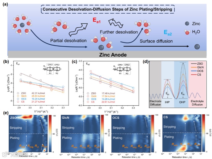锌离子沉积过程中的 “脱溶剂 - 表面扩散” 连续两步动力学行为,是主导沉积均匀性、进而影响枝晶生长的关键因素。借助电化学阻抗谱(EIS)结合 Arrhenius 方程、分布松弛时间(DRT)分析技术,深入解析动力学机制,证实 1D 低聚物代表 OCS 能够同步优化两步反应的能量壁垒:不仅将脱溶剂活化能降至 16.24 kJ mol⁻¹,表面扩散活化能更是低至 14.28 kJ mol⁻¹,这一数值显著优于 0D 单体与 3D 聚合物添加剂体系。DRT 分析结果进一步显示,OCS 体系的吸附 / 脱附电阻(R_ad)与表面扩散电阻(R_mig)在循环过程中始终保持稳定,而其他体系则出现电阻持续升高或剧烈波动的现象,表明 OCS 为离子传输构建了高效可逆的通道,从动力学层面切断了枝晶生长的根源。