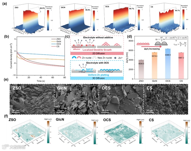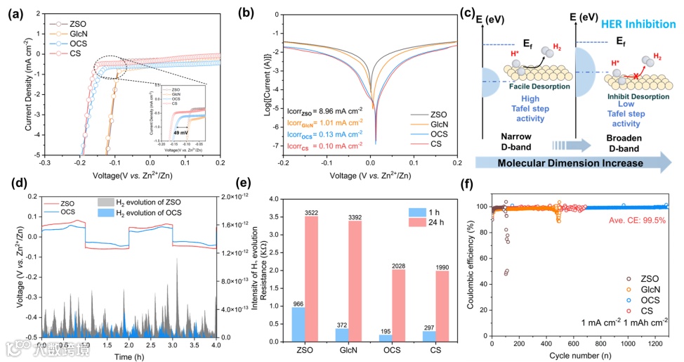 OCS凭借三重协同作用机制,实现了锌负极枝晶生长与析氢副反应的高效双重抑制:其一,OCS 可显著提升锌沉积过程中的 γ/η 比值,该关键参数的优化有利于诱导锌离子沉积形成大尺寸六边形晶粒,并促使晶粒沿垂直方向有序堆叠;扫描电子显微镜(SEM)与激光共聚焦显微镜(CLSM)的表征结果直观显示,经 OCS 修饰后的锌负极表面粗糙度大幅下降,呈现出平整致密的理想沉积形貌。其二,OCS 分子通过界面吸附作用破坏电解液中水分子的氢键网络结构,在锌负极表面构建一层致密的疏水性界面防护层,大幅减少活性水分子与锌电极表面的直接接触,从源头上降低水介导的腐蚀副反应发生概率。其三,OCS 能够精准调控锌电极表面的电子结构,通过改变锌表面 d 带宽度来增强氢原子的吸附能,进而显著抑制析氢反应(HER)的发生。