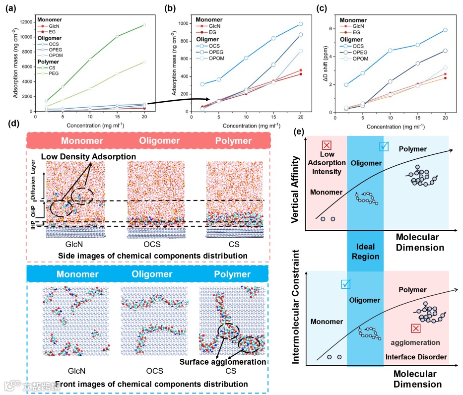 为深入解析分子维度对吸附行为的调控规律,团队结合石英晶体微天平 - 耗散监测(QCM-D)技术与分子动力学(MD)模拟,开展了系统性表征。