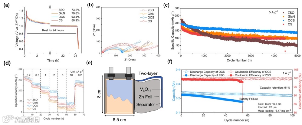 为验证方法论的实用价值,团队装配了不同规模的电池体系: Zn||V6O13全电池在 0.2-10 A g⁻¹ 宽倍率范围内容量保持 323.1-85 mAh g⁻¹,5 A g⁻¹ 下循环 5000 次容量保持率超 70%;0.2 Ah 软包电池在 1 A g⁻¹ 下循环 100 次容量保持率 91%。
