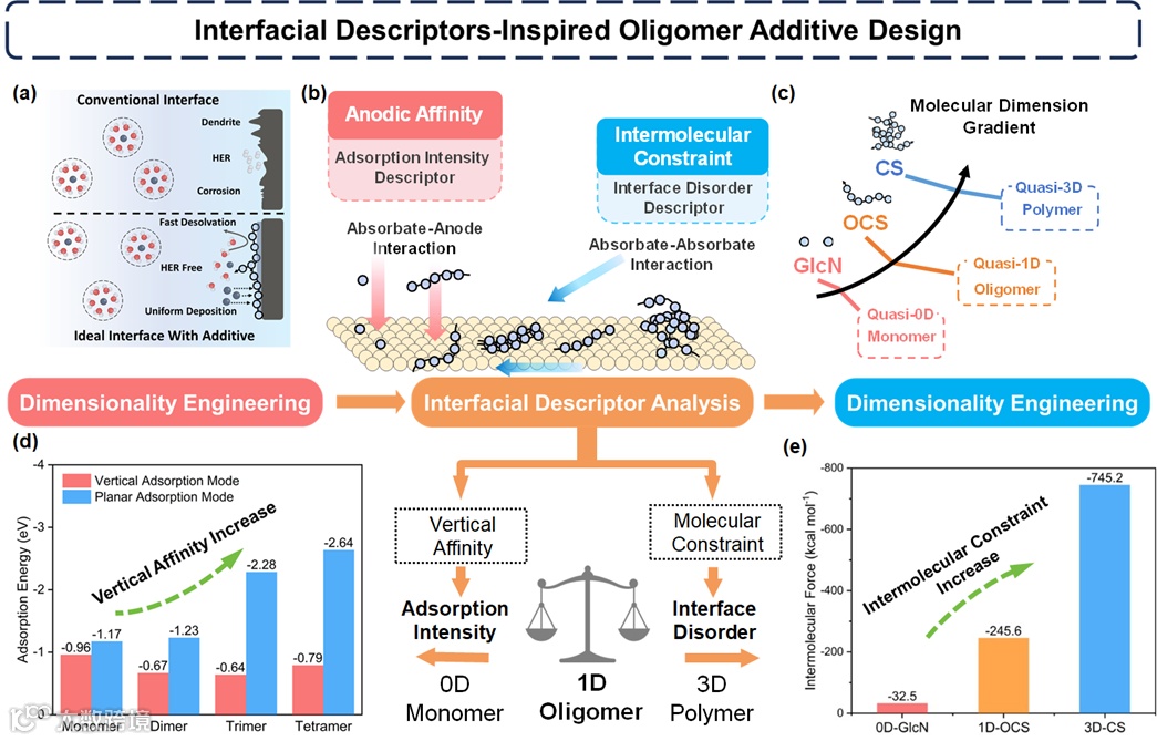 在下一代储能技术的激烈角逐中,水系锌金属电池(AZMBs)凭借原料低成本、固有高安全性,以及锌负极高达 820 mAh g⁻¹ 的超高理论容量,已然成为极具竞争力的核心候选体系。然而,其商业化进程却被锌负极的两大关键难题牢牢掣肘:锌枝晶的随机生长与析氢反应(HER)等界面副反应,不仅会严重破坏电极结构完整性,还会大幅削弱电池的循环稳定性与库仑效率。追本溯源,这些问题的本质是电极 / 电解质双电层区域内锌离子传输通量不均、沉积行为无序,以及活性水分子介导的界面副反应持续发生。在电解质工程的各类解决方案中,痕量功能添加剂凭借低添加量、高调控效率的突出优势,成为破解上述难题的热门路径。但遗憾的是,当前有机添加剂的设计思路仍受限于简化的Langmuir吸附模型,设计核心仅聚焦于最大化分子与电极表面的吸附能,却忽略了分子间相互作用对界面行为的关键影响。这一设计缺陷直接导致两类普遍问题:小分子添加剂虽溶解性优异,但界面吸附强度不足,难以形成稳定保护层;长链聚合物虽吸附能力较强,却易发生分子缠结与团聚,引发界面无序度升高、离子传输动力学迟缓。因此,打破传统经验化筛选的瓶颈,建立一套基于分子结构与界面作用机制的理性设计标准,已成为推动水系锌金属电池性能突破的关键科学诉求。