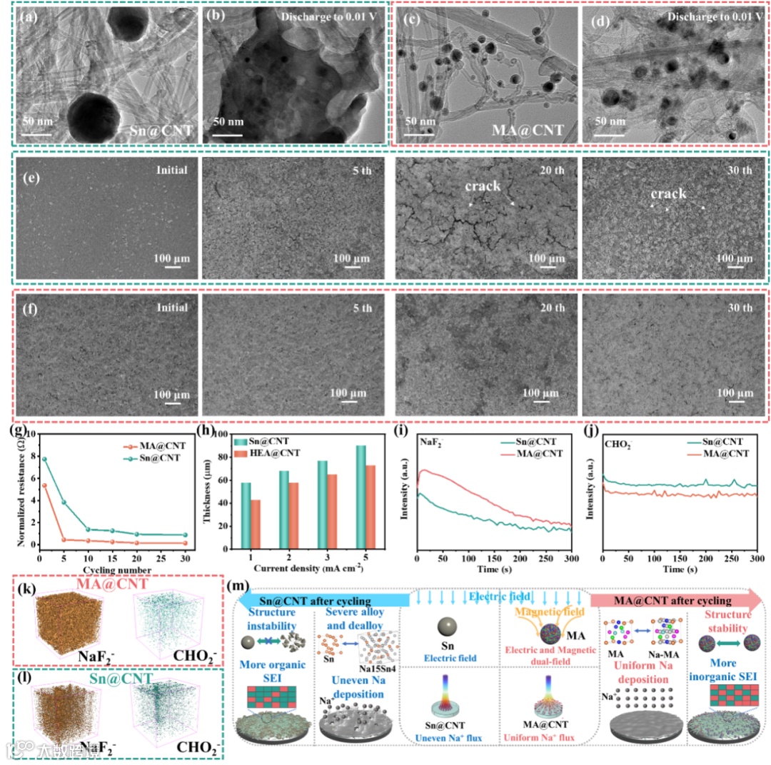 图5. MA的结构稳定性。(a,b) Sn@CNT在初始状态及放电至0.01 V时的 TEM 图像;(c,d) MA@CNT在初始状态及放电至0.01 V时的TEM图像。(e,f) Sn@CNT与MA@CNT基底在初始阶段及不同循环次数后的 SEM 图像。(g) 不同循环次数下的阻抗变化。(h) 在面容量为 5 mAh cm⁻² 条件下,Sn@CNT与MA@CNT在 1、2、3和5 mA cm⁻²不同电流密度下的钠沉积层厚度。(i,j) MA@CNT与Sn@CNT中NaF₂⁻和CHO₂⁻的ToF-SIMS深度剖析结果。(k,l) MA@CNT与Sn@CNT中NaF₂⁻和CHO₂⁻的空间分布图。(m) Sn@CNT与MA@CNT作用机制的示意图。