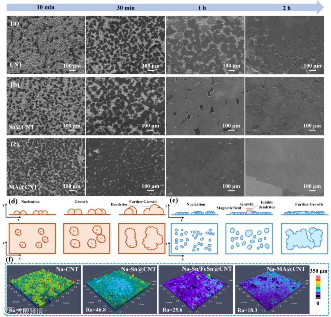 图2. 不同基底对钠金属沉积的影响。在电流密度为 1 mA cm⁻² 条件下,不同Na沉积容量下的(a)CNT、(b)Sn@CNT和(c)MA@CNT的时间序列SEM图像。(d)CNT 和(e)MA@CNT的Na成核与生长机制示意图。(f)在沉积容量为5 mAh cm⁻²时,CNT、Sn@CNT、Sn/FeSn@CNT及MA@CNT基底上钠沉积的LCSM图像。