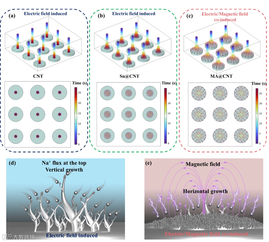 图3 磁场对钠金属沉积的作用机制。(a) CNT、(b) Sn@CNT 和 (c) MA@CNT 条件下Na⁺轨迹的模拟结果。(d) 仅电场作用下钠沉积行为的示意图,以及 (e) 电–磁双场协同作用下钠沉积行为的示意图。