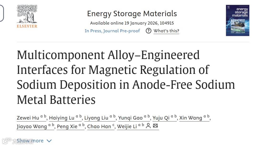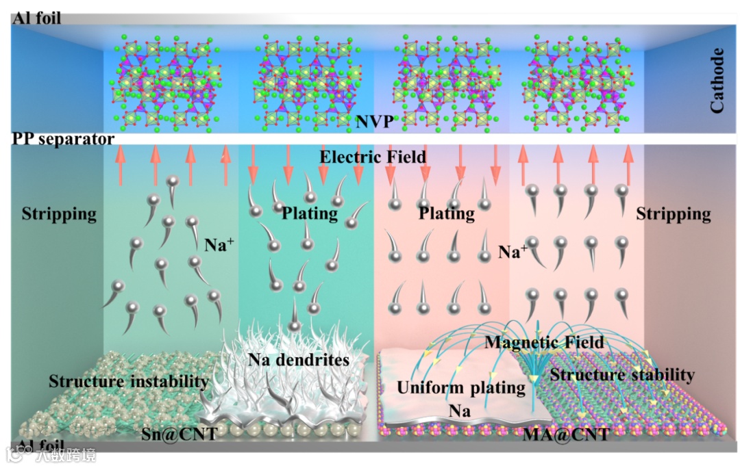 近日,中南大学李维杰课题组在Energy Storage Materials发表题为“Multicomponent Alloy–Engineered Interfaces for Magnetic Regulation of Sodium Deposition in Anode-Free Sodium Metal Batteries”的研究论文。文章提出了一种磁-电双场界面调控策略:将FeCoNiCuSn多元合金与碳纳米管复合材料(MA@CNT)涂覆于商用铝箔集流体,构建多功能界面层。该界面中,碳纳米管形成连续导电网络,提供空间约束以抑制合金颗粒粉化;Sn作为亲钠元促进均匀成核,Fe/Co/Ni等磁性元素则在沉积过程中产生局部磁场,通过洛伦兹力调控Na⁺迁移路径,使离子分布更均匀、抑制尖端效应。多元合金结构还可缓解合金化过程中的体积膨胀,从而提升界面稳定性。实验与理论表明,该策略显著提高了钠沉积的可控性与循环稳定性,且对应的无负极钠金属电池展现出优异的倍率性能与长寿命表现。该研究为解决AFSMB界面失稳问题提供了新的思路,并为高能量密度钠金属电池的实际应用提供了重要参考。