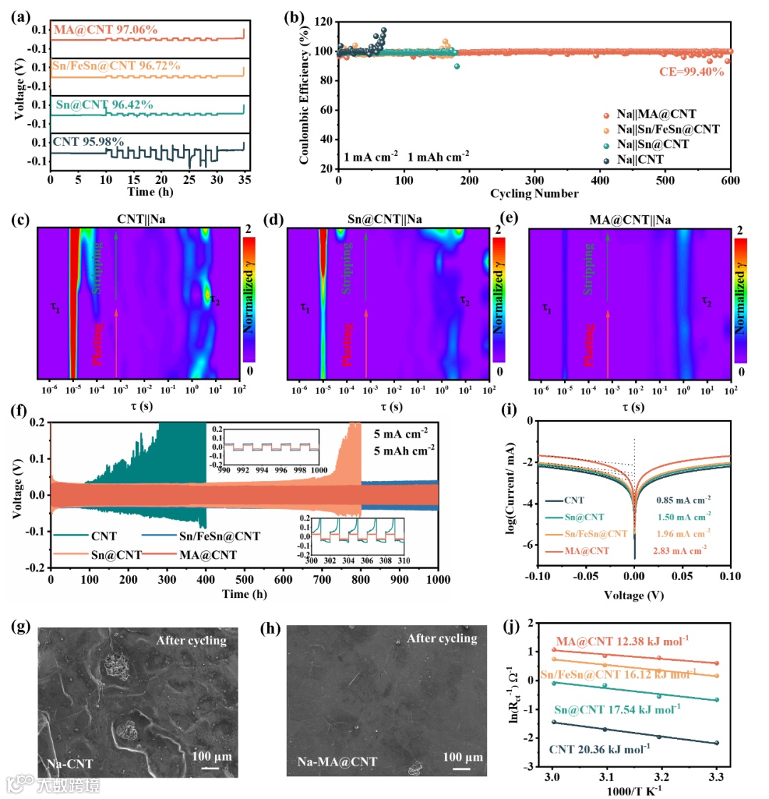 图4. 钠沉积/剥离的可逆性。(a) Aurbach库仑效率曲线。(b) 在1 mA cm⁻²、1 mAh cm⁻²条件下非对称电池的库仑效率(CE)变化曲线。(c–e) 原位EIS测量得到的Nyquist曲线对应的DRT结果,分别对应CNT||Na、Sn@CNT||Na和 MA@CNT||Na电池。(f) 在5 mA cm⁻²、5 mAh cm⁻² 条件下对称电池的循环性能。(g) 循环后Na–CNT和 (h) Na–MA@CNT的SEM图像。(i) 不同基底的Tafel曲线及 (j)相应的活化能(Ea)。