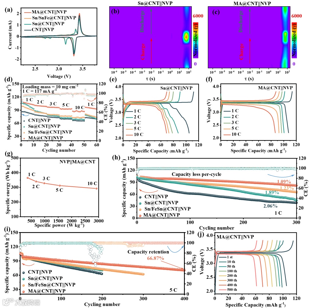 图6. 无负极钠金属电池的电化学性能。(a) CNT||NVP、Sn@CNT||NVP、Sn/FeSn@CNT以及 MA@CNT||NVP 的循环伏安(CV)曲线。(b,c) 原位EIS测试获得的Nyquist曲线对应的DRT结果,分别对应Sn@CNT||NVP和MA@CNT||NVP电池。(d) CNT||NVP、Sn@CNT||NVP、Sn/FeSn@CNT和 MA@CNT||NVP的倍率性能。(e,f) Sn@CNT||NVP和MA@CNT||NVP在不同电流密度下的充放电曲线。(g) MA@CNT||NVP的Ragone 图。(h,i) 在 1C和5C条件下,CNT||NVP、Sn@CNT||NVP、Sn/FeSn@CNT及MA@CNT||NVP无负极电池的长循环性能。(j) MA@CNT||NVP无负极电池在不同循环次数下的充放电曲线。