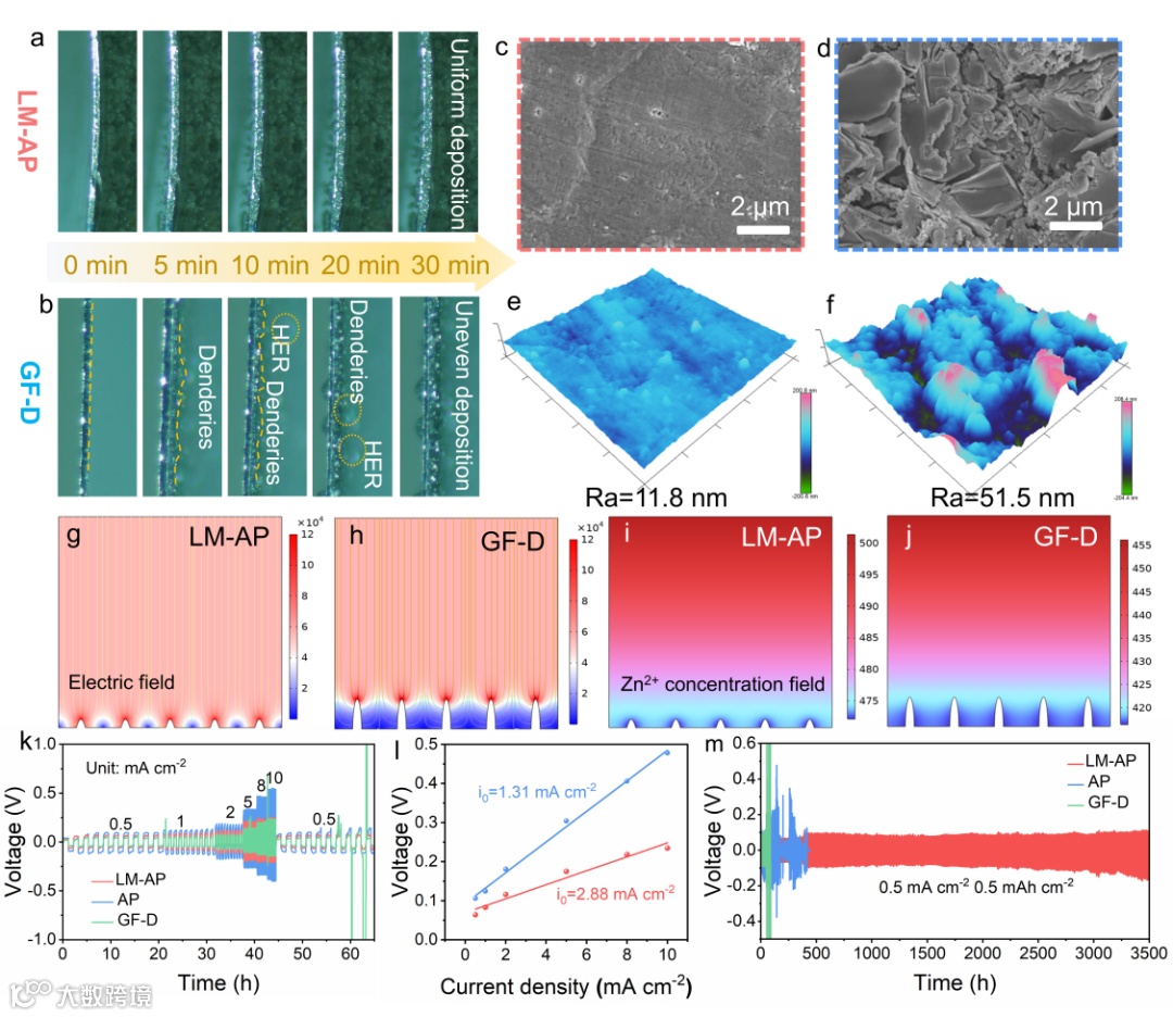 图4 (a) LM-AP和(b) GF-D电沉积过程的光学显微镜图像。(c,e) LM-AP和(d,f) GF-D锌阳极循环10次后的SEM图像以及AFM图像。(g,i) LM-AP和(h,j) GF-D中Zn阳极的电场和离子场分布。锌对称电池的(k)倍率性能,(l)交换电流密度和(m)循环性能。