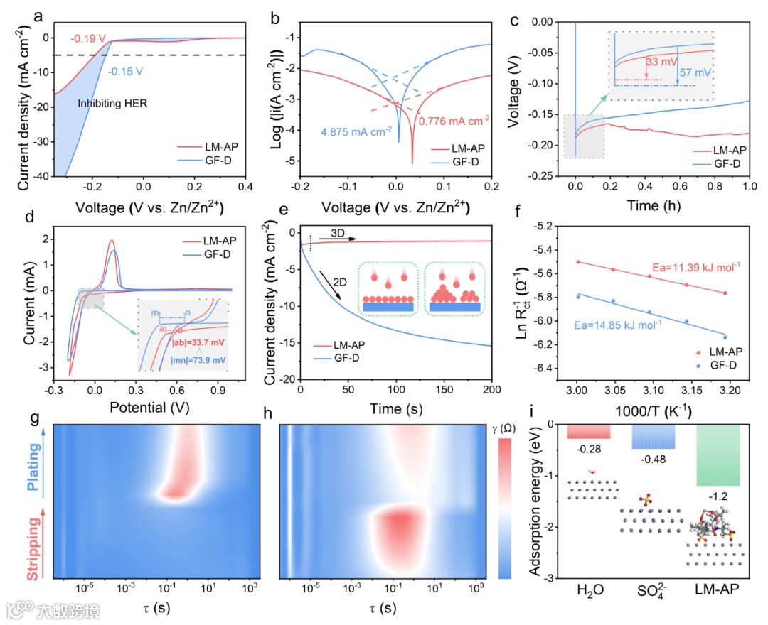 图3 (a) GF-D和LM-AP的HER和(b) Tafel曲线。(c) NOP曲线。(d) Zn||Ti电池的CV曲线。(e) CA曲线。(f) Zn||Zn对称电池的Arrhenius曲线和Ea。(g) LM-AP和(h) GF-D的DRT。(i) Zn(002)表面H2O、SO42-和LM-AP的吸附能。