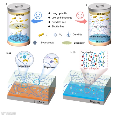 图1. (a)传统液态电解质的锌碘电池在不同界面处的存在的关键性问题,以及(b) LM-AP水凝胶电解质同时规整(i)阴极和(ii)阳极电解质界面的工作机理示意图