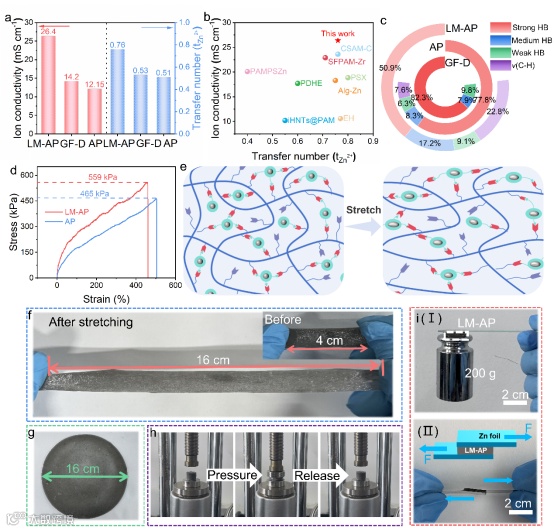 图2 (a) LM-AP、AP和GF-D的离子电导率和锌离子转移数。(b)离子电导率和锌离子转移数比较。(c) LM-AP、AP和GF-D中氢键比。(d) LM-AP和AP的应力-应变曲线。(e)拉伸过程中LM-AP结构变化示意图。(f-i)LM-AP的不同力学性能展示。