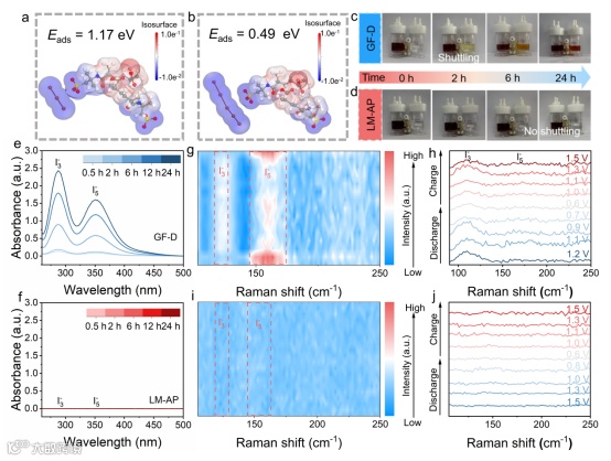 图5 LM-AP与(a) I3-和(b) I5-的结合能和静电势。(c,e) GF-D和(d, f) LM-AP做为隔膜在H型电解池中的光学图像及不同时间下的紫外-可见吸收光谱。(g, h) GF-D和(i, j) LM-AP组装的锌碘电池的原位拉曼光谱。