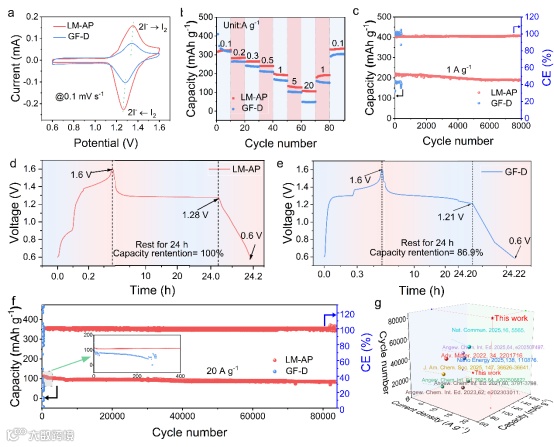 图6 (a) CV曲线,(b)倍率性能。(c)循环性能。 (d) LM-AP和(e) GF-D自放电曲线。(f) 20 A g-1高倍率下的长循环性能。(g) 已报道的锌碘电池的性能比较。