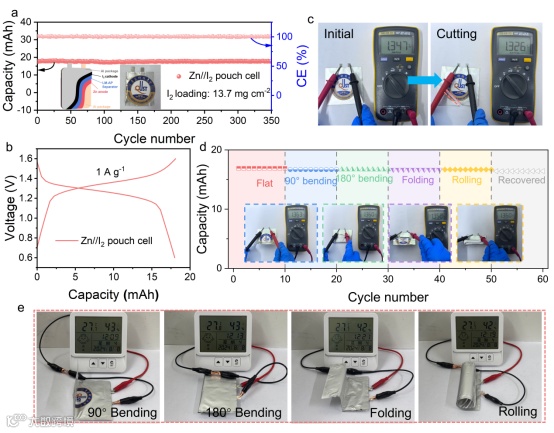 为了进一步证明 LM-AP 的实际应用潜力,组装了锌碘软包电池。该软包电池放电平台与纽扣电池的放电平台极为相似,表现出良好的电化学性能,并在切割状态下仍能保持稳定的电压,这表明采用 LM-AP 的锌碘软包电池能显著提高电池的安全性。此外,当处于不同的变形状态时,锌碘软包电池能够保持电压不变,稳定的为湿度计供电,体现出良好的柔韧性。